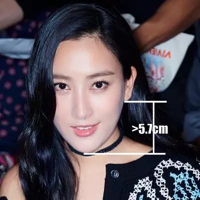 相较于眉毛到鼻头的面部中庭,王子文的脸蛋下缘明显较短,这也直接将她耳垂到下巴的距离,划在小于5.7厘米的范围内。