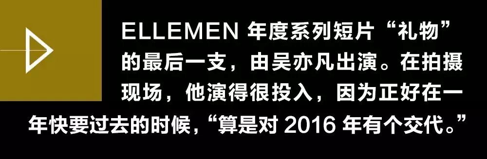 过去一个月,ELLEMEN陆续发布了年度系列短片“礼物”的前三辑。它们分别探讨情侣、父子与夫妻之间的关系。而你即将看到的,是这个系列的最后一支短片,它的主角是吴亦凡,探讨自己与自己的关系。
