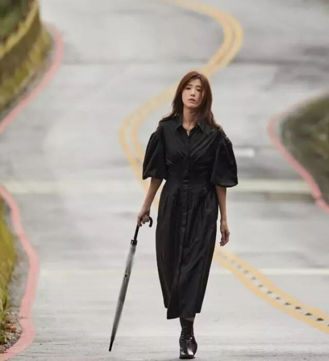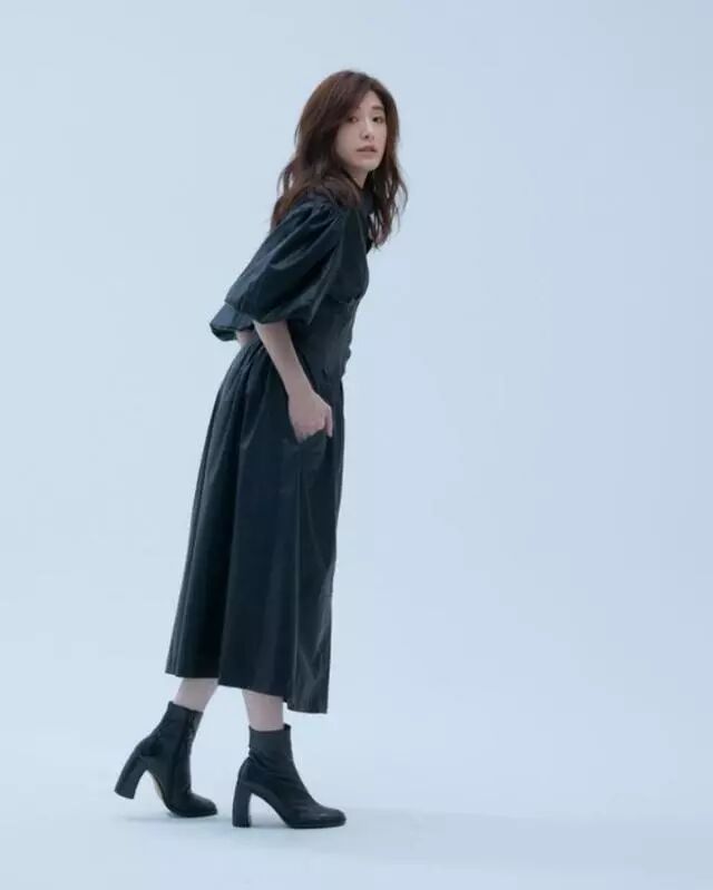 只见这是一款简简单单的黑色长裙,没有其他的任何装饰,仅仅是依靠裁剪让裙子本身有了很多的折皱,看起来非常的与众不同。而两臂的泡泡袖也让赋予了这件裙子十分高级的时尚感。再搭配上一款黑色的短靴,不仅在色调上十分协调,更让整体风格更加凸显。在这件裙子的衬托下,49岁的苏慧伦更具有青春活力和高雅的气质。