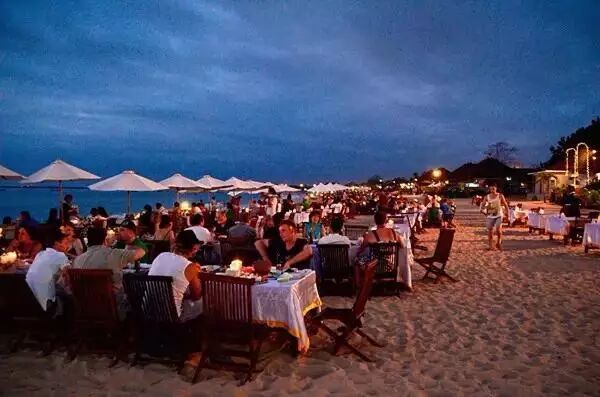 夜幕下的金巴兰是一个浪漫的地方。在海滩看着日落,听着歌手们演唱各国歌谣,享用着当地特色的海鲜烧烤,再点上一杯冰镇的巴厘之星啤酒,海浪轻柔拍岸,美食、美景、美酒,别有一番情趣,令人无比沉醉。