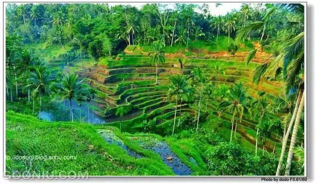 巴厘岛田园风光的精华都在Tegallalang梯田,你将看到满眼柔和的绿色,你可以在这里喝杯下午茶,度过惬意的午后时光。椰林与稻田完美地交相辉映,景色实为独特。很美的梯田,门票只要一个人印尼盾5000,人民币3元不到。
