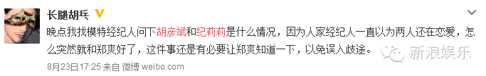 郑爽说是去年8月认识胡彦斌,而9月份胡彦斌还在和纪莉莉谈恋爱,所以。。。?