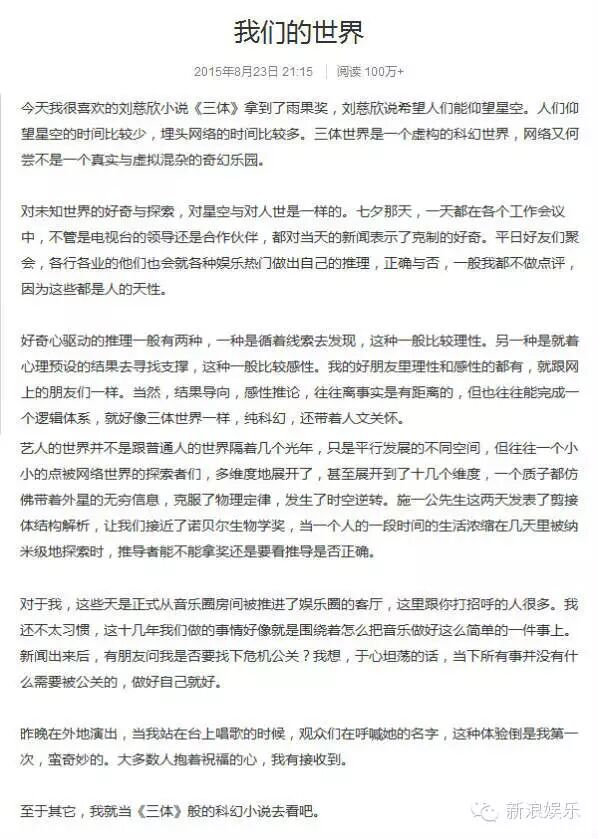 而昨天胡彦斌也通过微博发表了一篇长文,说对于突然的热情还不太习惯,要做好自己。