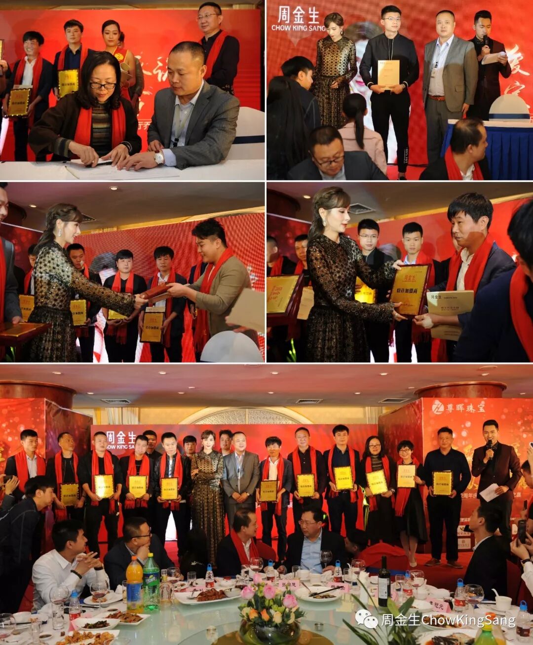 当晚的签约现场把此次活动推向高潮,周金生品牌代言人杨恭如女士和周金生总经理张建斌先生亲自为15位新签约客户授牌。