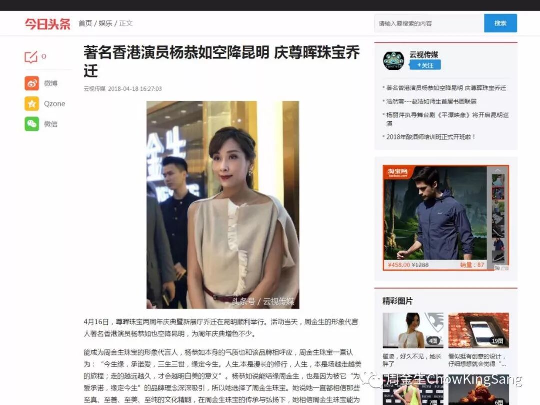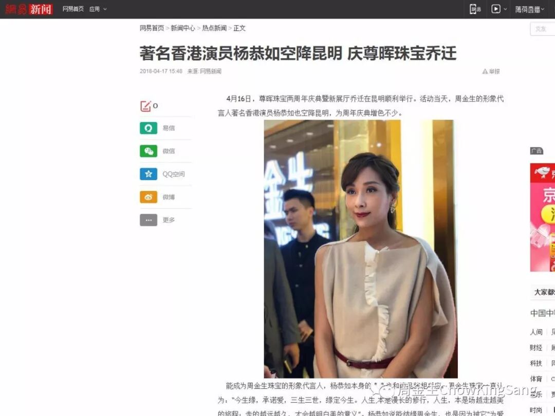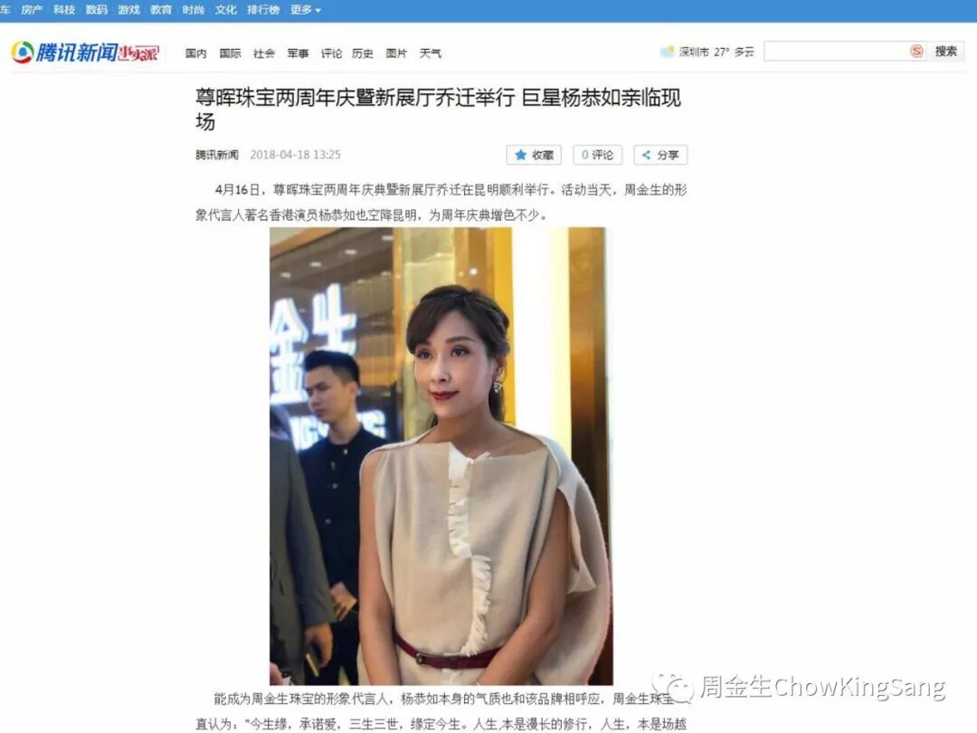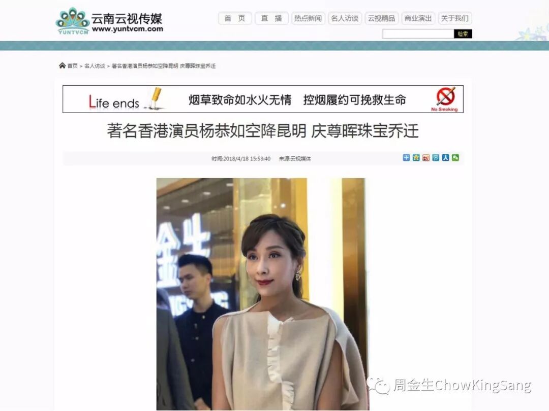 4月16日,尊晖珠宝两周年庆典暨新展厅乔迁在昆明顺利举行。活动当天,周金生品牌代言人著名香港演员杨恭如空降昆明,为周年庆典增色不少。