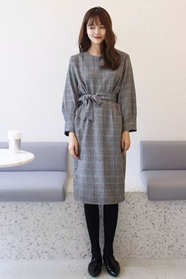 搭配推荐look2、深色系大衣&格纹连衣裙