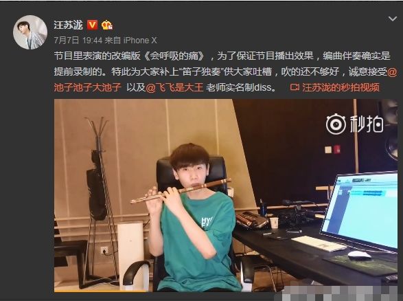 被池子质疑假吹笛子之后,汪苏泷马上在微博中发出自己真吹笛子的视频,表示自己在节目中因为节目的安排,为了有更好的音乐效果,所以汪苏泷在节目中并没有真吹,节目组放出来伴奏,但重点是汪苏泷是会吹笛子的,在视频中也看到汪苏泷的确是会吹笛子。