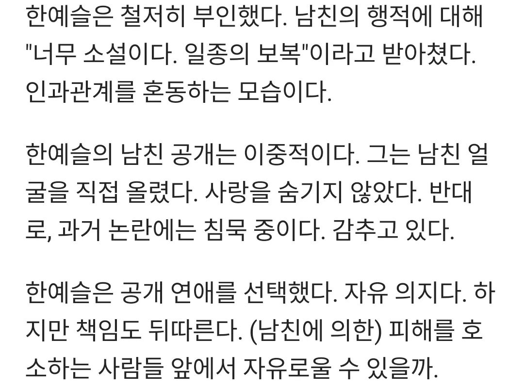 “本以为韩艺瑟介绍男朋友时,会一同公开他的过往。以为韩艺瑟会说,‘和我男朋友的过往无关,我爱他,请大家支持我’。”