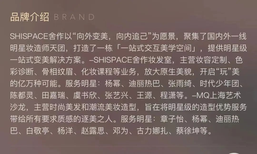 整体来看,SHISPACE舍作以“明星妆造师私人订制”为主打卖点,店内共有六名驻店妆造师,且均有为一线明星提供妆造服务的经验。此外,在服务上,SHISPACE舍作还提供海量高奢彩妆产品,且无需准备工具,并宣称“全球50+彩妆品牌免费用”。