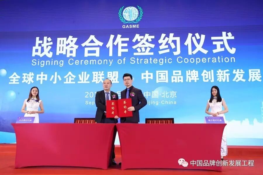 图为:中国品牌创新发展工程与全球中小企业联盟签约仪式