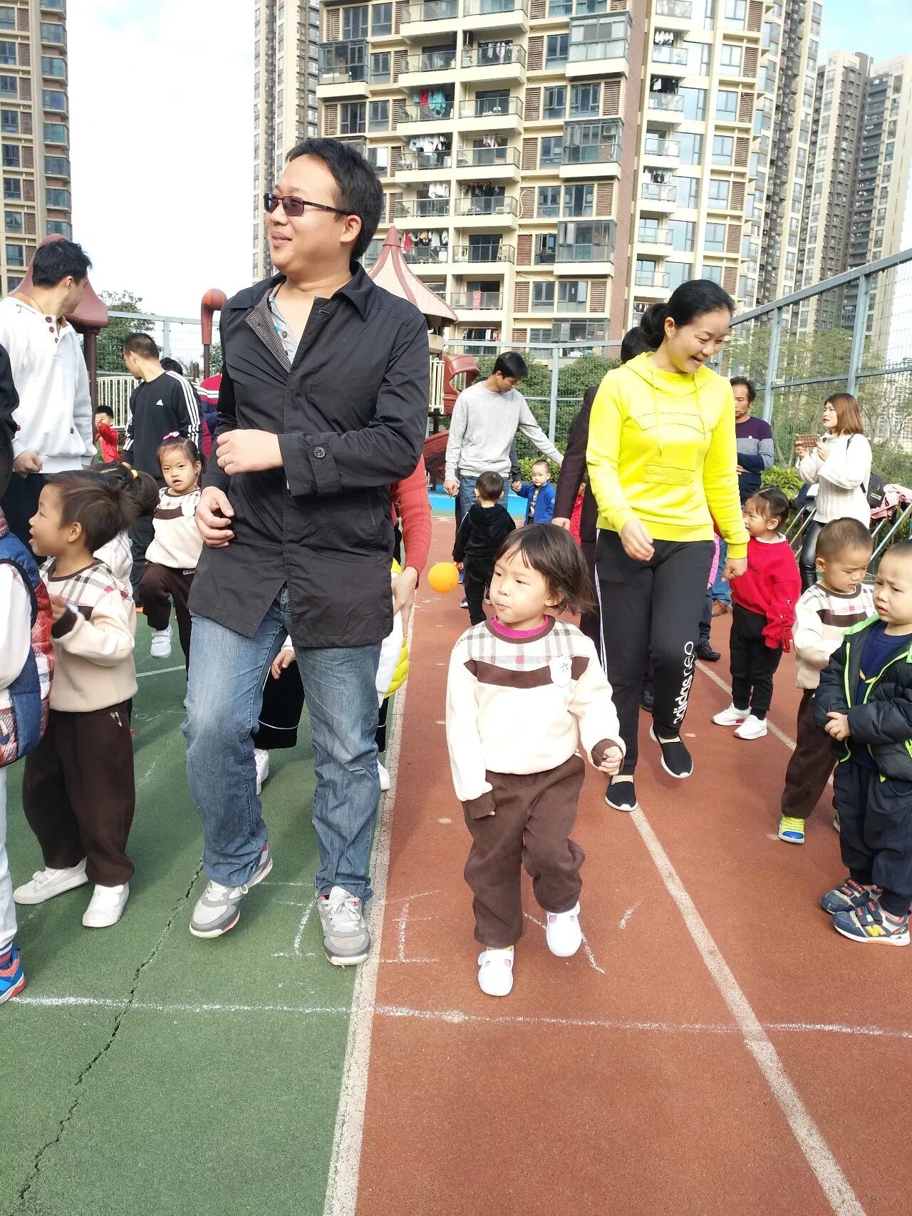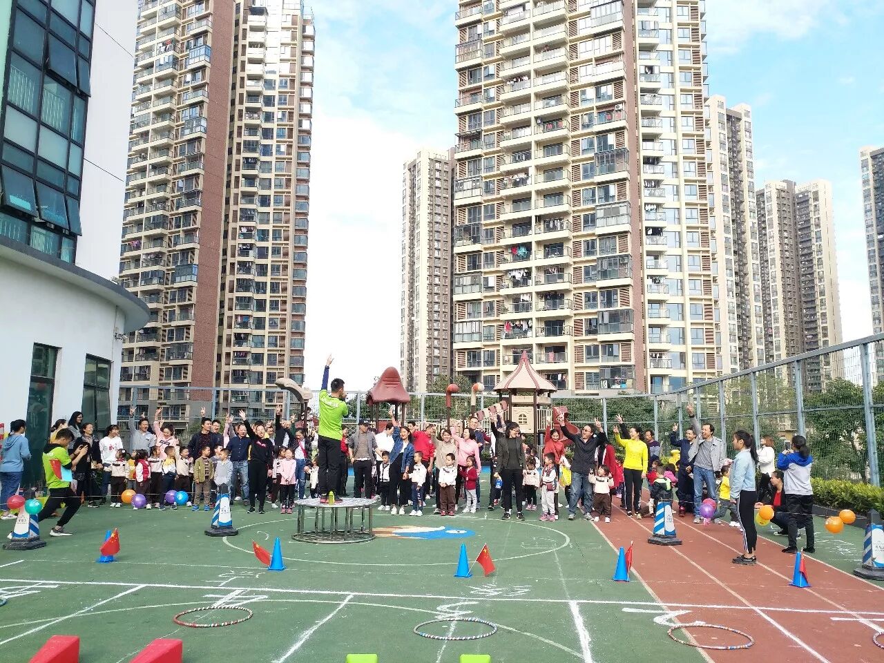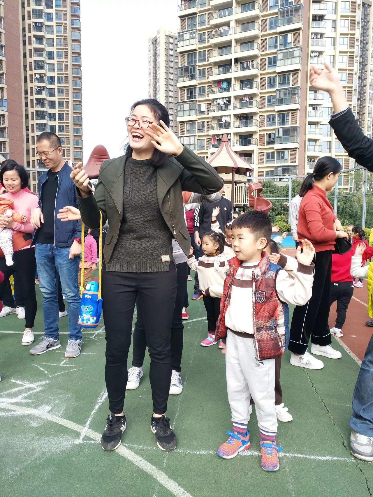 2018年1月4日上午,万科璞悦山幼儿园开展了“童心、 童梦、 共成长”冬季亲子 运动会亲子比赛——旗开得胜、赶小猪回家。幼儿园内人气高涨,孩子们拉着家长的手来到了我们的操场,小小运动员们整装待发,爸爸妈妈们热情洋溢,跟随着老师的带动下进行了全场热身环节合着欢快的音乐舞动起来,运动赛事拉开了序幕。接下来看看我们精彩的比赛过程吧!