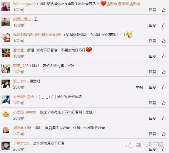 看完谢娜的刘海照,网友评论道:“娜姐我觉得你还是露额头比较青春活力”“你还是露大脑门好看”“娜姐,你真的不适合刘海儿”“娜姐 刘海不好看喽!不要刘海好不好”“娜姐还是扎起来或者中分好看些”“娜姐短发好看,有刘海像老女人”“娜姐还是把刘海弄上去吧,别的就不多说了。”