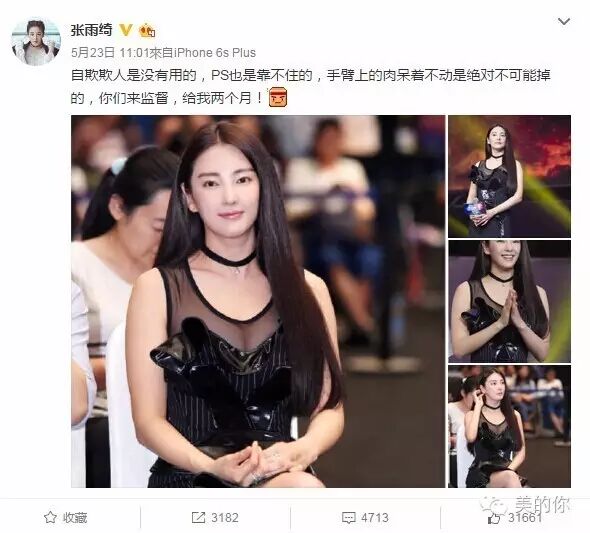 这年头女明星官方发出来的照片,几乎都经过修图师傅的巧手,毕竟我们在朋友圈发个照片可能还要十里挑一外加美颜呢。可是张雨绮同学居然自己把未PS的粗!胳!膊!照片发了出来▼