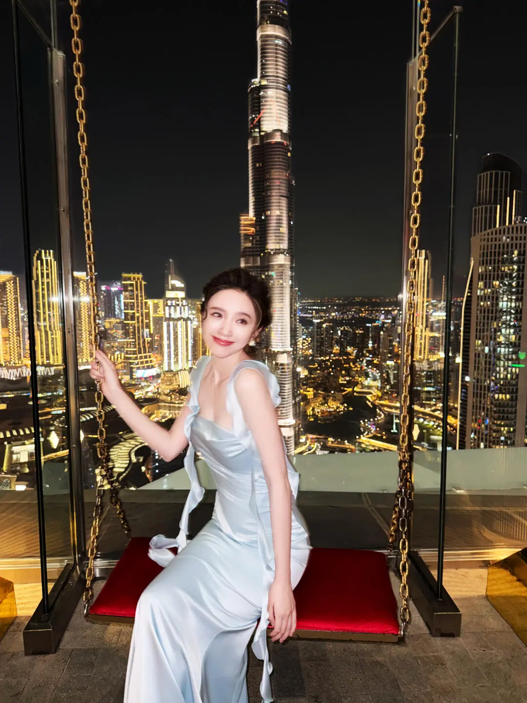 秋千上那套在月光下泛着珍珠光泽,她坐在秋千上晃动时,直角肩随动作起伏,优雅又灵动。她太懂怎么扬长避短了,露背装既性感又不低俗,搭配高腰线,身材曲线完美呈现 S 型。