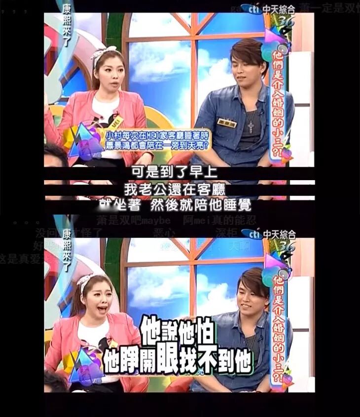 有一集《康熙来了》,主题恰巧是“介入家庭的小三”,请来的全都是和自己的另一半过于亲密的朋友,亲密到快要吃醋。Mei就吐槽丈夫萧景鸿看着发小儿小村睡觉。还为了给对方送美食便当,拖家带口等了3小时。