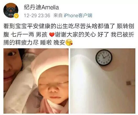 12月29日晚23:36分,歌手纪敏佳发布微博公布自己产子的喜讯:“看到宝宝平安健康的出生吃尽苦头啥都值了,顺转刨腹,七斤一两,男孩,谢谢大家的关心,好了,我已被折腾的精疲力尽,睡啦,晚安”。