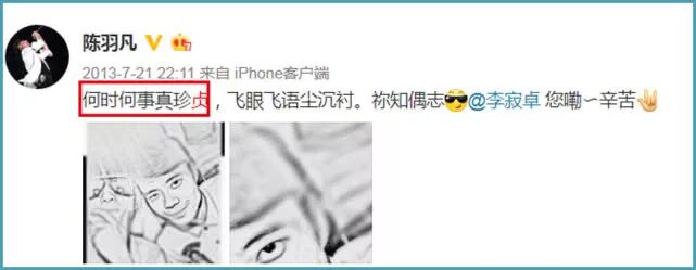 2013年,陈羽凡发了“何时何事真珍贞”,这里面蕴含了“何时贞”的整个名字。