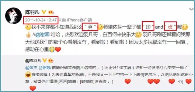 2011年也能发现陈羽凡的“真贞珍”字眼,那时候他是为自己与白百何参加“快本”做宣传,彼时谢娜热烈欢迎陈羽凡、白百何来快本,而陈羽凡回复谢娜的动态里却包含有一堆打了引号的“真贞珍”。