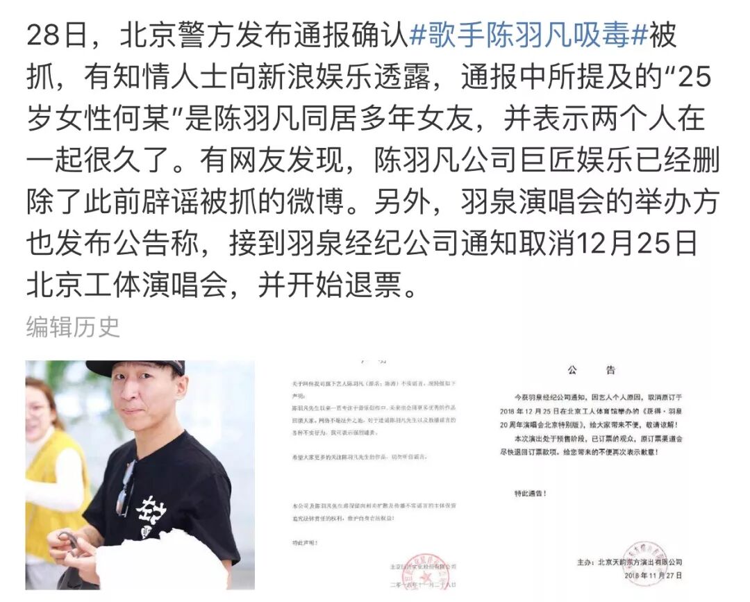 11月28日陈羽凡被爆出因吸毒被抓,同时被抓的还有一位“同居多年的25岁女友”。