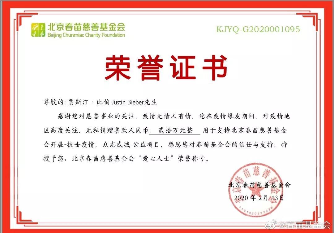 2月13日晚,春苗基金会晒出贾斯汀·比伯为武汉捐款的荣誉证书,感谢他捐赠的20万元善款,并授予“爱心人士”称号。