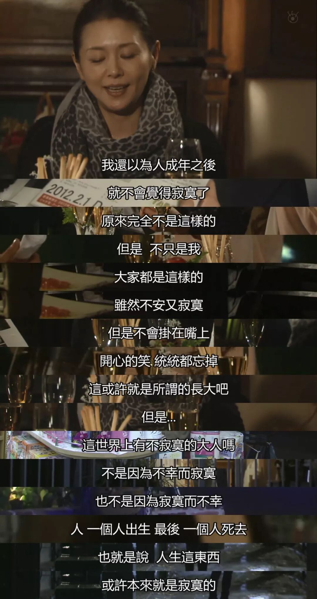 “世上没有不寂寞的大人,所以不要为了填补寂寞而恋爱。就算没有恋爱人生也能很精彩,人生可能就是爱上自己的未来。爱上自己的未来这样人生一定更有乐趣。如果将来喜欢上了谁。不要把它当最后一场恋爱,下一场恋爱是人生倒数第二场恋爱。”
