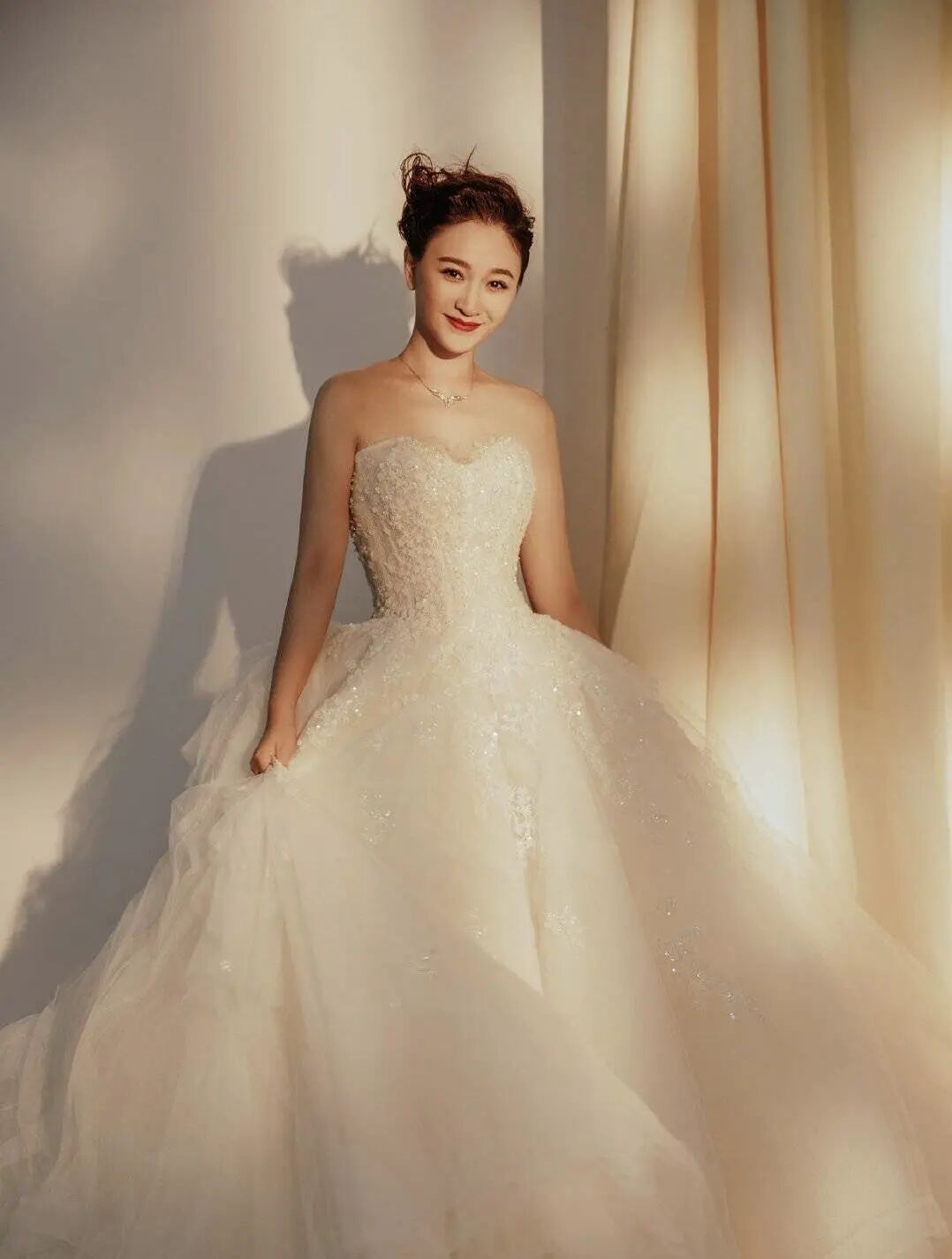 白色纱裙是所有女人心中的白月光,李小冉用一袭白色纱裙演绎出什么叫仙女下凡。抹胸款的设计最大程度秀出漂亮的天鹅颈和锁骨线,以及紧致而修长的双臂,李小冉原本就是巴掌脸,把头发盘起来后更显得小巧精致。蓬蓬的白纱层层叠叠,晶莹剔透的小碎砖点缀在纱裙上,营造出如梦如幻的极致浪漫。