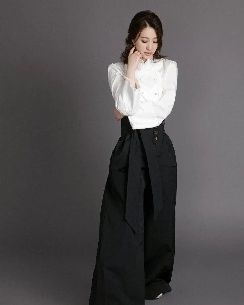在另一组硬照中,百变的李小冉又展示出别致的异域风情。白色缎面衬衫光泽度好,质感一流,款式上创新的采用中西合璧的设计,花边领的形状借鉴了传统中山装立领,修饰了脸型,双排扣的前襟结合了欧洲宫廷礼服的灵感,华丽精致。下半身是一条黑色高腰阔腿裤,超宽松的裤腿,整个造型别致新颖,上紧下松,呈现出撩人的曲线美。
