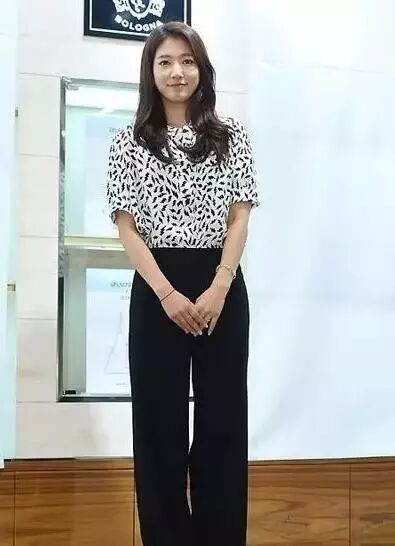 朴信惠身穿白色竖条纹衬衫配藏蓝色竖条纹长裤,经久不衰的竖条纹元素就是优雅知性的代名词,朴信惠这身轻熟装扮演绎的很到位.