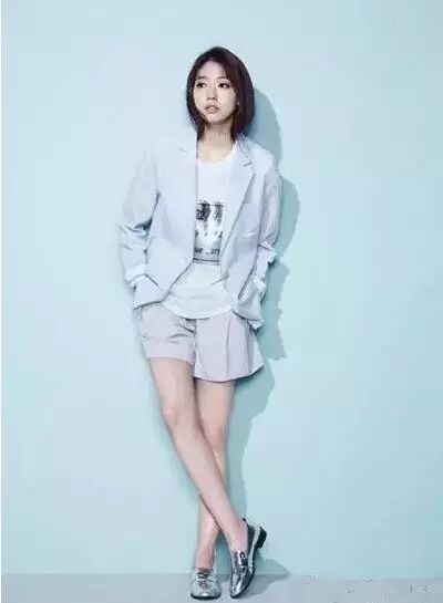 浅蓝色小西装清新精致,典型的韩式风格,搭配T恤和短裤,知性又时髦,展现韩式OL的迷人风采。