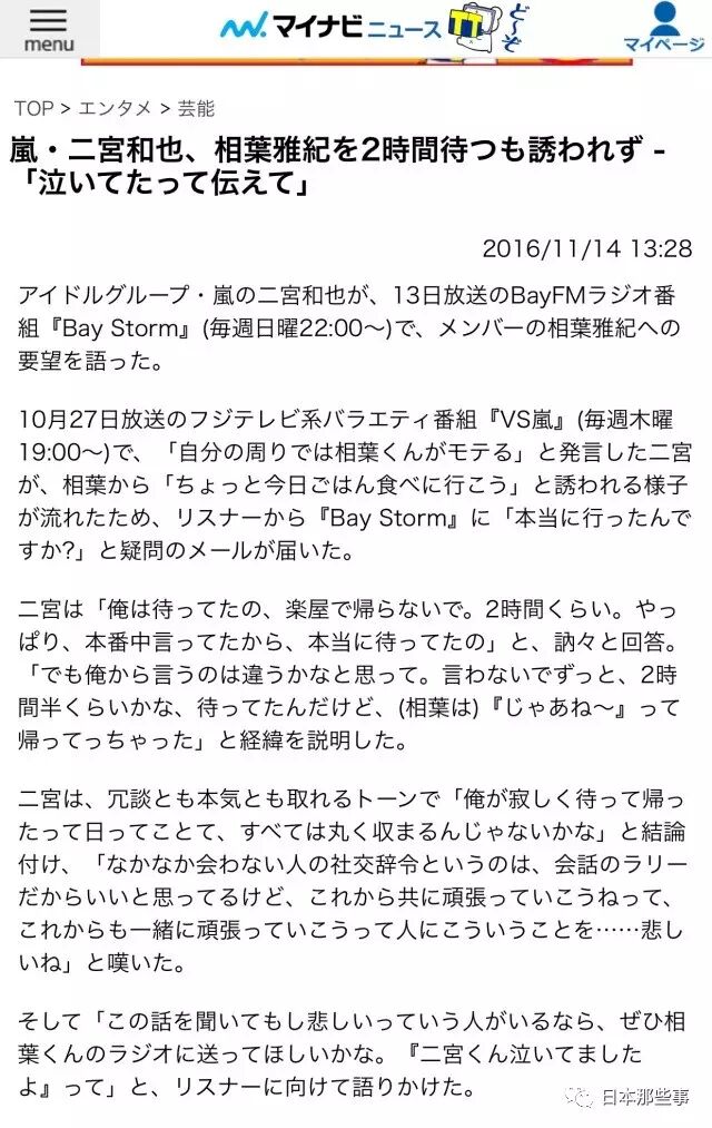 12.18最新一期的BAYSTORM广播,二宫和也先生“理智冷静”地回应了相叶雅纪先生的质疑。并且又一次让粉丝给小拔哥的广播写信。(PO主:你们有话当面说不好吗?)