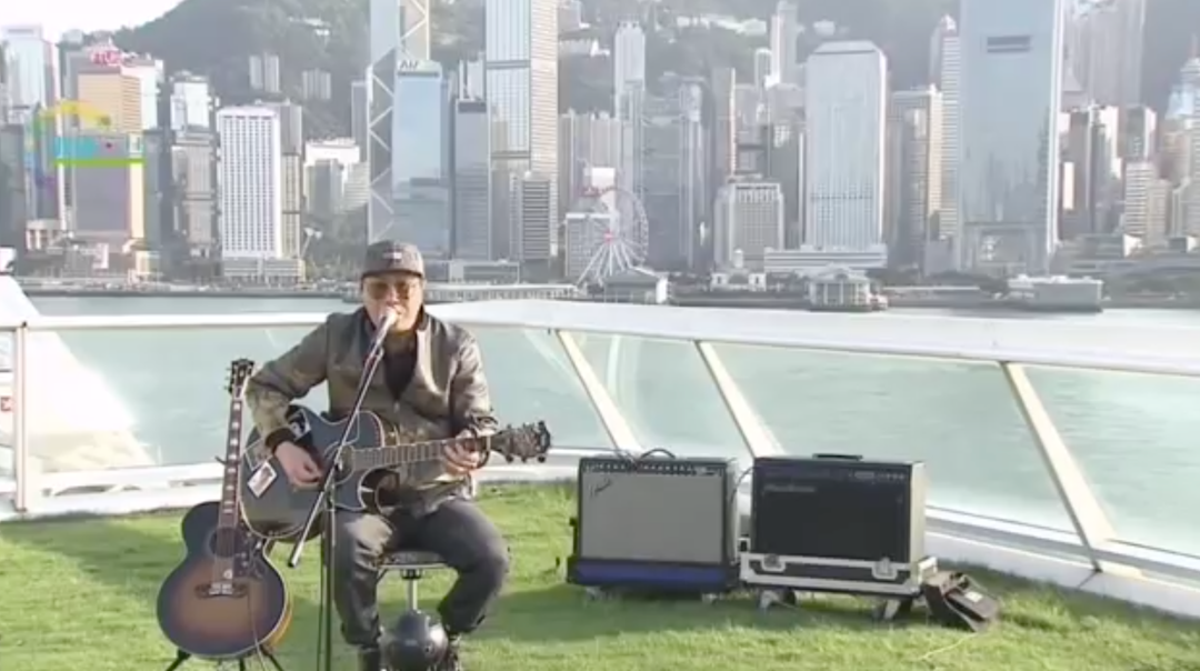 “既是同舟,在狮子山下且共济。”尖沙咀海港城的天台上,熟悉的《狮子山下》歌声响起。没有观众,没有乐队,71岁的许冠杰身穿花纹皮衣、头戴棒球帽,架着一副墨镜,抱着吉他自弹自唱,精神十足。
