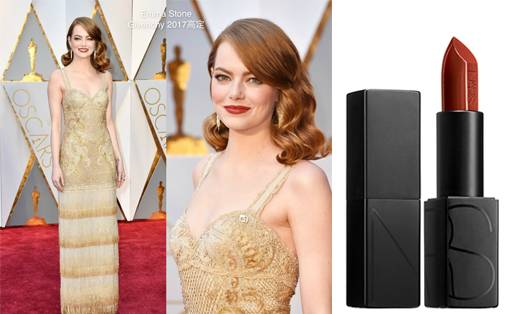 奥斯卡中的造型则更为惊艳。礼服为金色Givenchy 2017高定款,优雅华丽;口红则选择了Nars的Mona色号,显得石头姐的皮肤更加白皙,不得不说,唇色为整体造型提分不少!