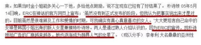 朴诗妍曾和神话组合队长文晸赫有过一段恋情,Eric主动追求的朴诗妍而且大方的公布恋情。
