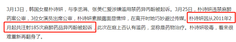 但是这个说法并没有说服力,报道中披露朴诗妍2011年2月起共注射185次麻醉药品而被判处有期徒刑8个月缓期执行,并且缴纳罚款370万韩币。