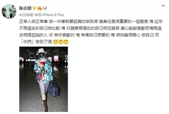 一早陈志朋对昨晚上流传出的负评作出回应:“正常人做正常事做一件事就要认真的做到底负责任是很重要的一个态度俺从来不跟过去的自己做比较俺只愿意跟现在的自己相互竞争真心谢谢喜欢把俺跟过去相提并论的人你有你喜欢的俺有俺自己想要的俺很快乐很开心做自己而「你们」做到了吗”。