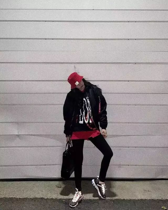 大胆地演绎红黑色经典型格配色,并以黑色打底裤突显修长美腿,红色渔夫帽亦是潮人必备单品。