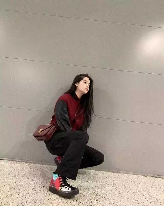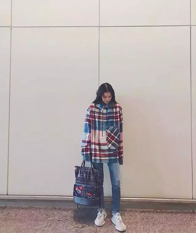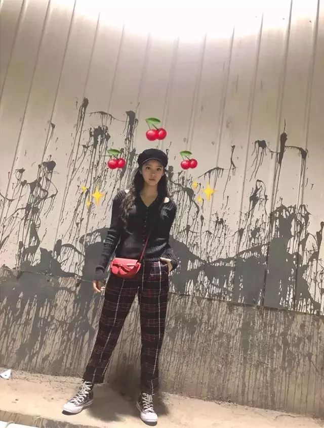 格纹元素也经常出现在欧阳娜娜身上,加上一顶帽子,颇有日系感。当然格纹裤更不能少,黑色上衣和红色小包来搭配,充满英伦学院风。