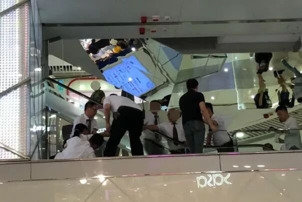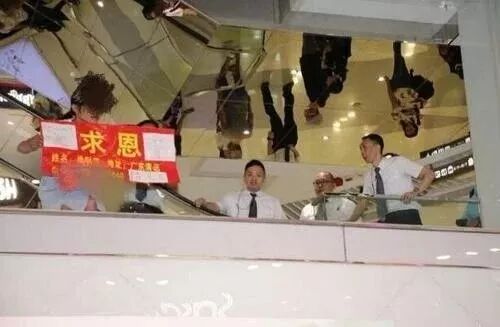 当时,她不顾危险翻过电梯围栏就站在没有任何遮掩的露台,现场足足出动了7位保安来制止她。