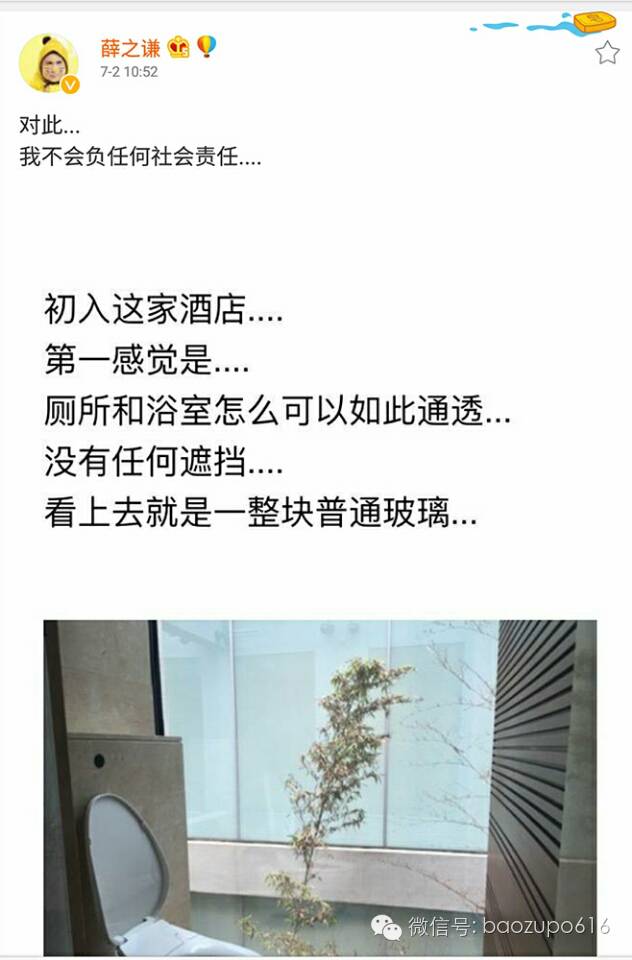 大薛称自己所住酒店厕所和浴室都只有玻璃,没有任何遮挡。