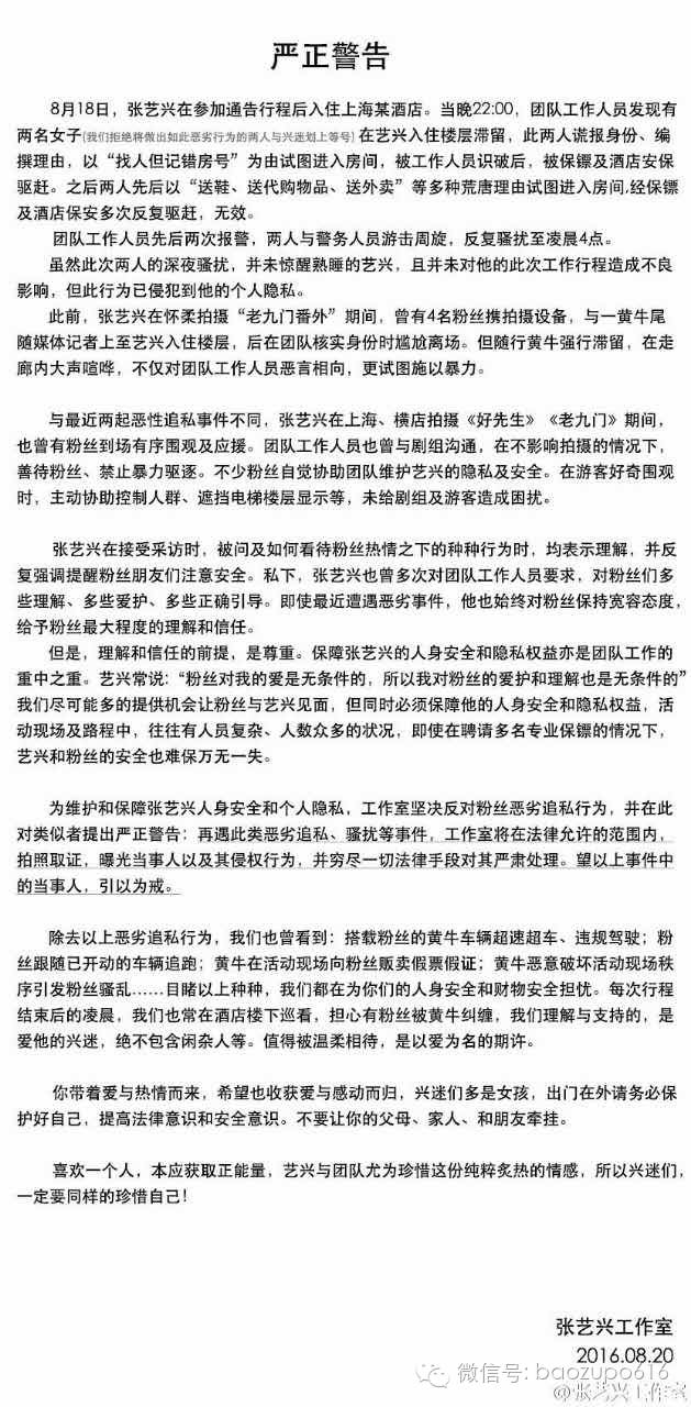 最近也就是8月18日,“二爷”张艺兴也遭遇了两起追私。张艺兴工作室在8月20日发布了一则“严正警告”,称:8月18日,在张艺兴的入住酒店有两名女子以各种理由想要混入艺兴房间,不过被工作人员识破。(吃瓜观众在此想表扬工作人员真机智!!!)团队先后两次报警,两人却与警务人员周旋游击,反复骚扰到凌晨4点!