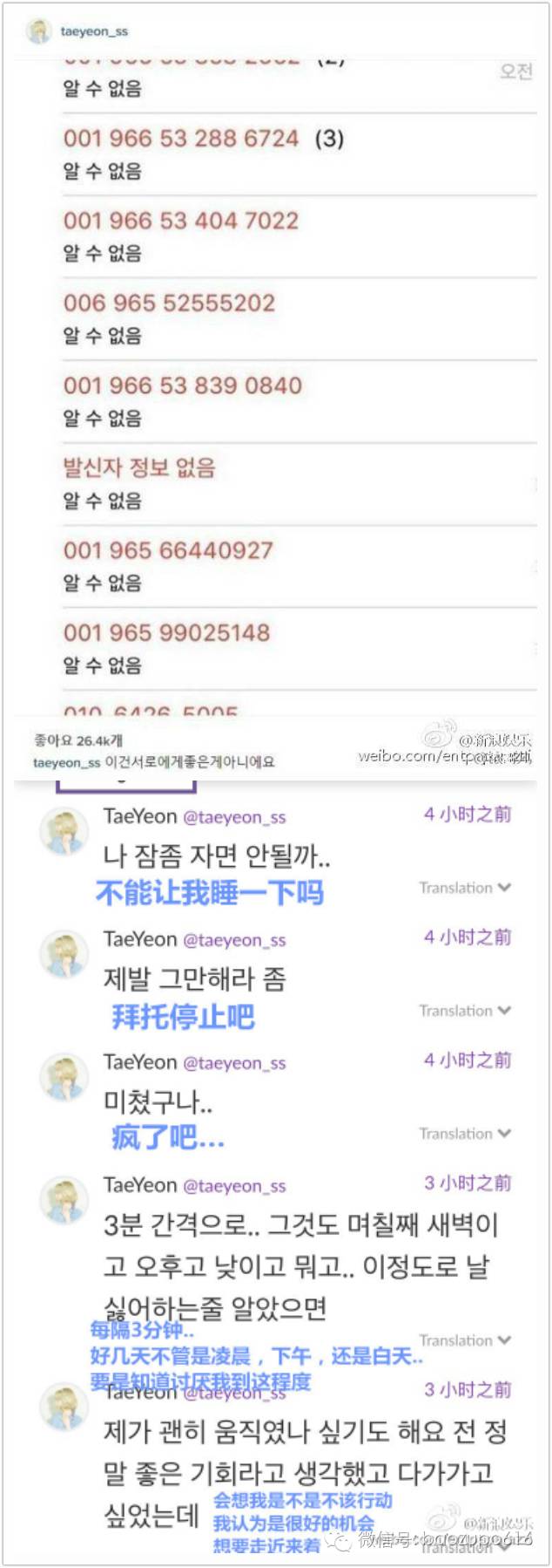 韩国女团少女时代队长泰妍今年就曾在ins上公开自己的通话记录,截图中可以看到从第一天晚上到第二天清晨,都有私生饭狂call她的手机,逼得她不得不在ins发声:“我想睡觉!”这种骚扰行为真是让人觉得可恨也觉得无奈!