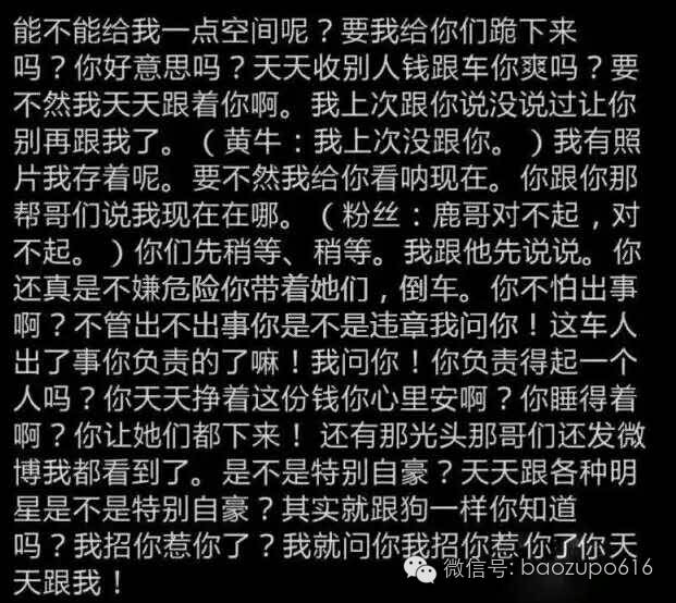 就在同一时期还有两段小鹿与黄牛的对话视频流出,小鹿怒斥黄牛:“能不能给我一点空间?这车人出事儿你负责的了吗?”下图为视频之一中的对话内容,小鹿还秒变温和对跟车的粉丝说:“你们先稍等,我先跟他说说。”男友力max有木有!!