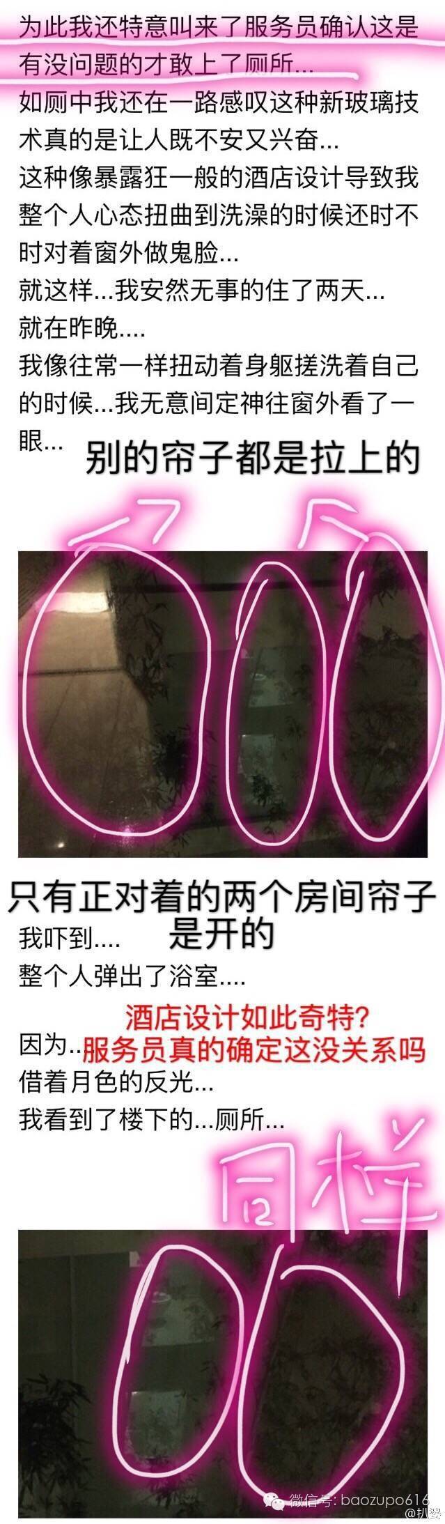 对此大薛还叫来服务员确认是没有问题的,傻傻的以为这种玻璃从里面可以看见外面,外面看不见里面。但是洗澡的时候发现别的房间都有帘子,楼下的厕所也同样有帘子!只有自己的房间没有!