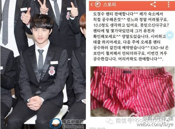14年1月,一名EXO私生饭在网上兜售D.O.穿过的内裤和袜子,还放话接受预约,表示EXO宿舍受到严密保全监控,这些物品都是“辛苦”拿来的。
