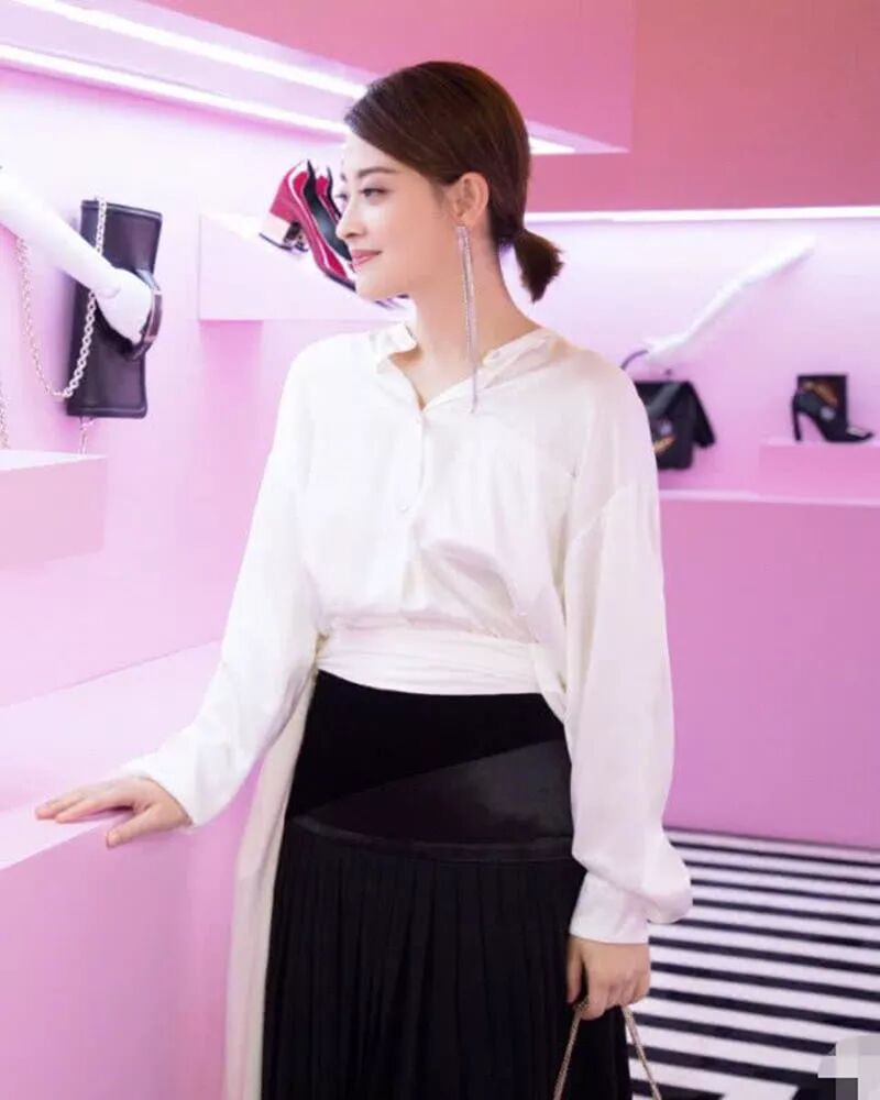 梅婷身穿白色上衣,比较舒适的面料,看上去很简单,中间收腰的设计,展现出开梅婷的腰线,下身搭配黑色裙子,黑白搭配经典时尚,戴着银色流苏耳环,增加了几分时尚感,扎着优雅低马尾,很可爱!不得不说梅婷保养的皮肤很不错,完全看不出来像40多岁的人呢。