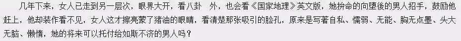 查小欣为她站台,写了一篇漏洞百出的文章:几年下来,女人已走到另一层次,也会看《国家地理》英文版,然而男人没有任何长进。