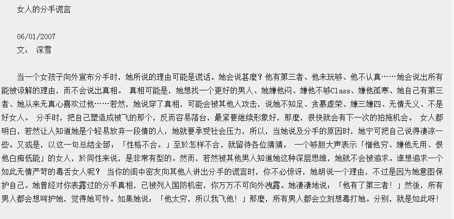 女作家深雪发过一篇小文。大意就是说,一个女孩子,说分手原因的时候,怎么会坦诚讲是自己嫌弃这个男人呢,以后谁还敢追求她呢,当然要凄凄惨惨的说,我被甩了,他有别人了,这样所有人都会想要保护她啦。