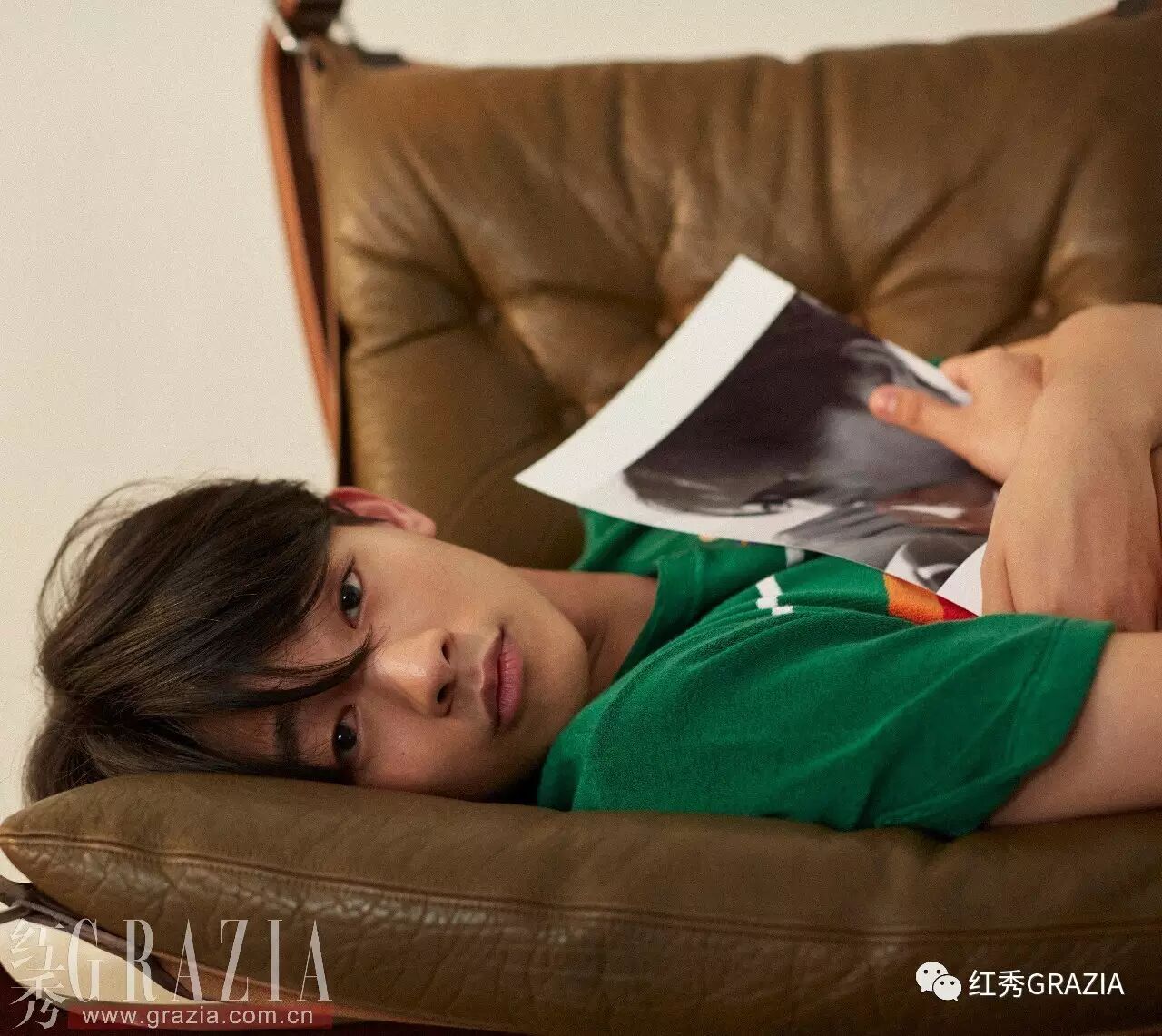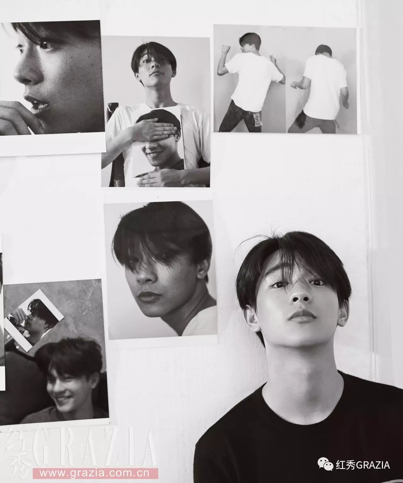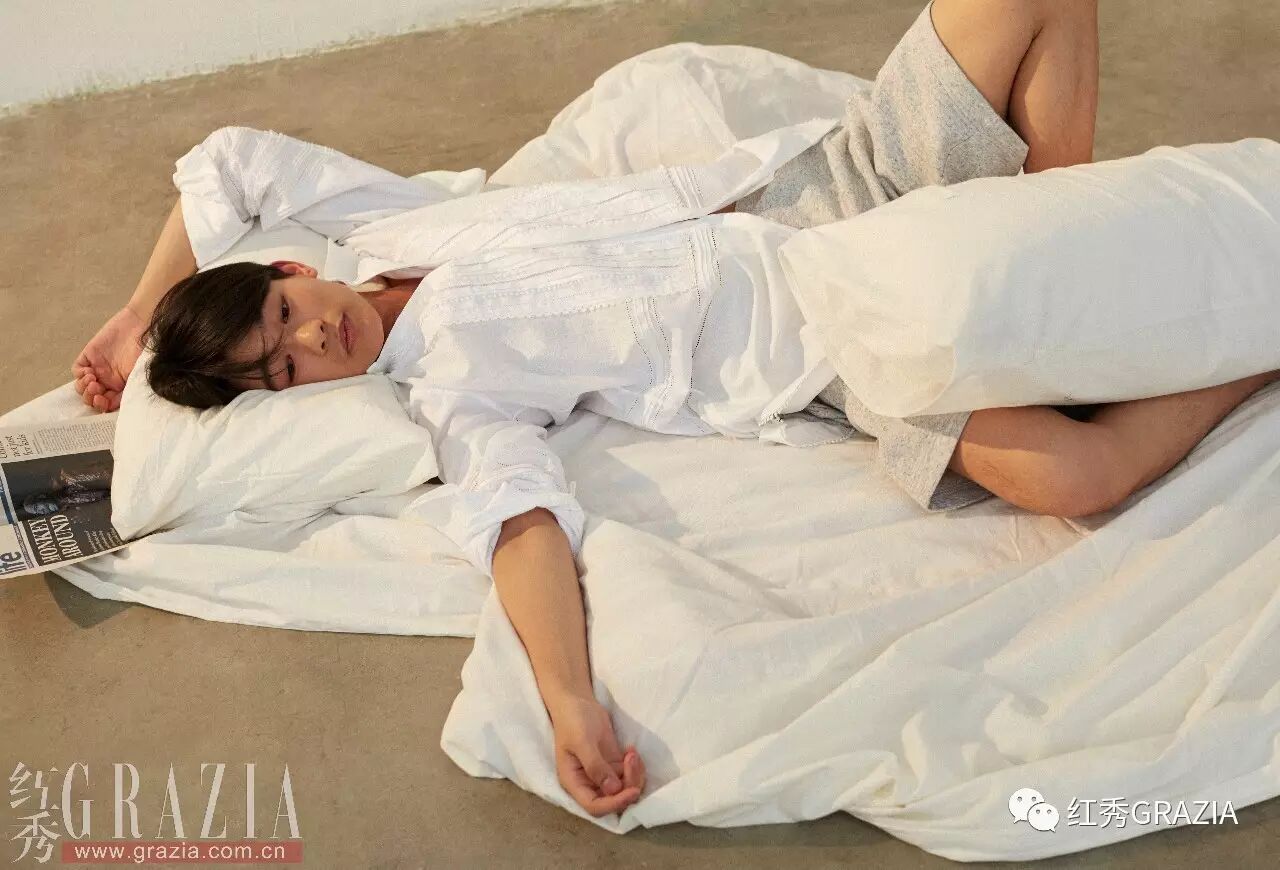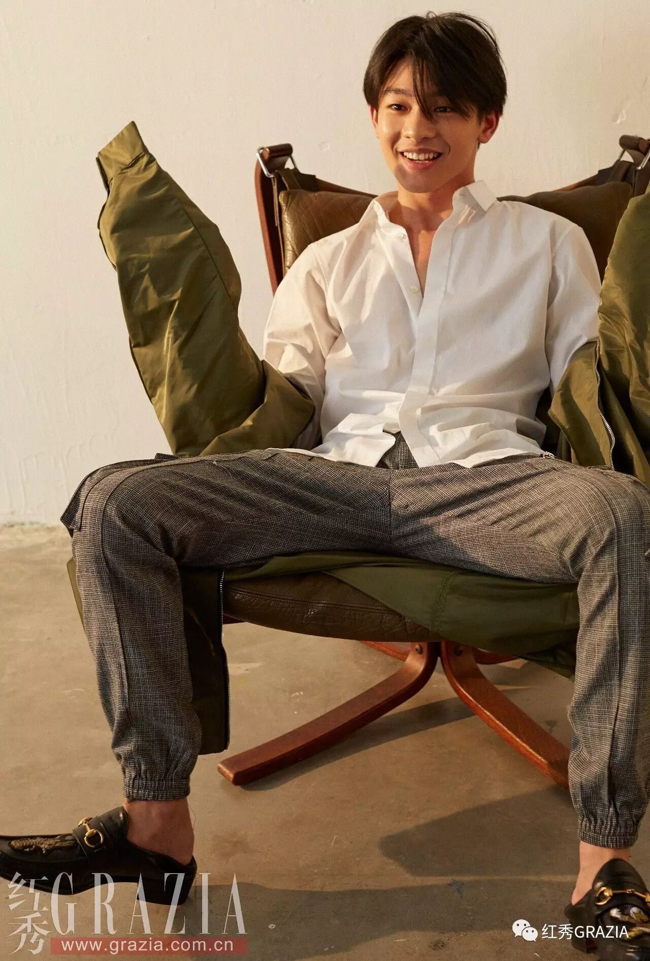 和张宥浩碰面时GRAZIA 吓了一跳——这个男孩子怎么两眼通红?一问,才知道他昨夜看剧本看到大半夜。听闻拍摄时的几个pose 是趴在床单上,他乐得直喊:“可以睡?太好了!”如此可爱、随性、真性情,现场立马圈粉。
