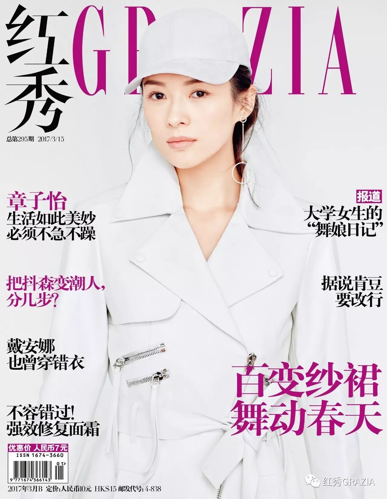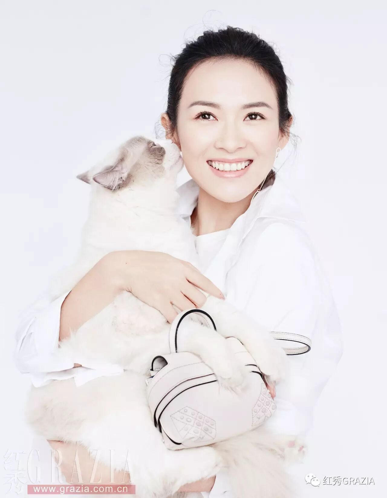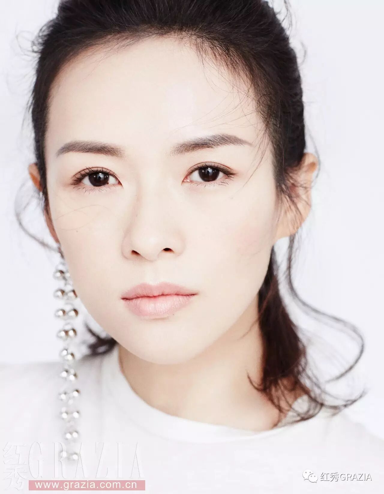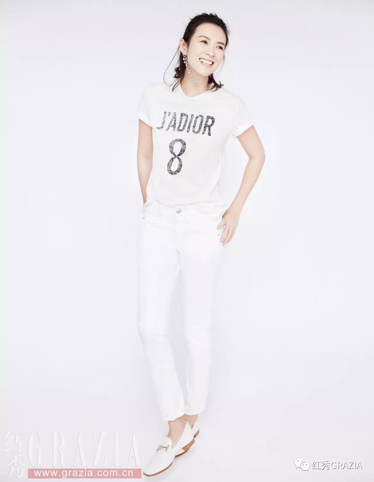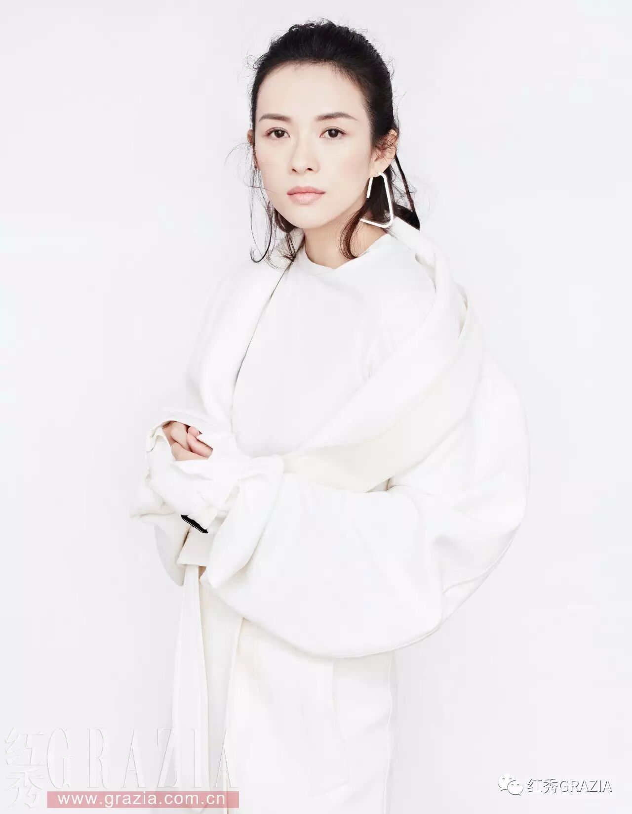第一眼看到的章子怡,穿着一身黑,夹克、练功裤、运动鞋,扎全光的干净马尾,更像个练习舞蹈的女孩,一手接过要换的衣服,说开始吧!这次拍摄的主色调是白色,妆容极淡,不着眼妆。说起来,谋女郎都是穿白衬衫的高手,简简单单的,就很美了。