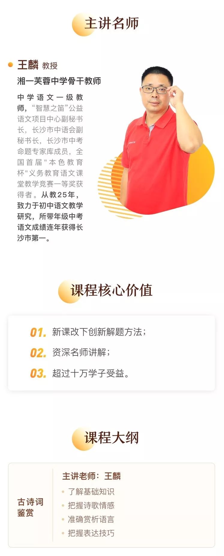 因此我们请来了教学经验丰富的王麟老师为同学们带来古诗词鉴赏的高分突破方法。同时也告诉同学们古诗词阅读并没有那么难学。我们完全可以用对古诗词的兴趣爱好来学习古诗词,并且从容应对考试。